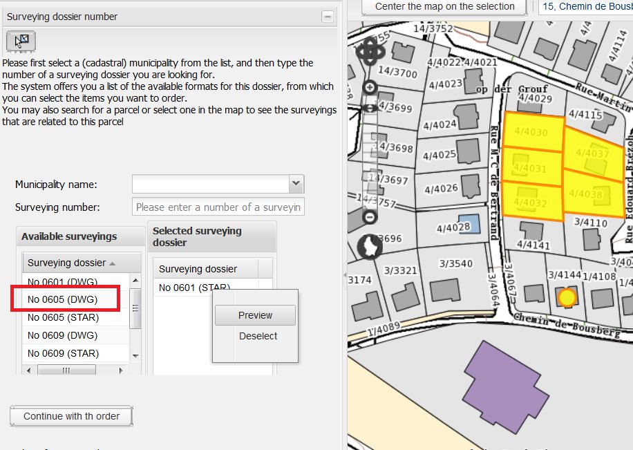 In this context a file of an official surveying dossier means a digital file that has been created during the procedures undertaken by an official surveyor, where surveying data is processed in a GIS system to update the cadastral database and to produce the surveying plan. These files may be useful for architects and consulting engineering bureaus when working on their projects. The Administration du Cadastre et de la Topographie offers these files in 2 formats, the DWG format and the STAR format.