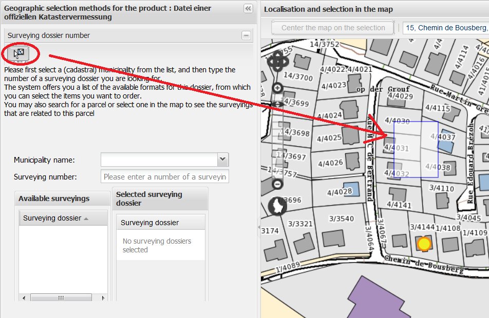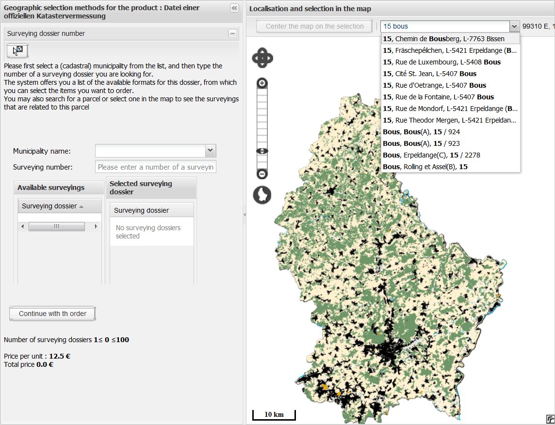 Then in the 2nd step, you have to select the surveying dossier you need. The most common approach is to first select the parcel(s) and to have the system search for the existing surveying files. As shown in the picture below, you can for example use the search field on top of the map window to enter an address or a parcel number: