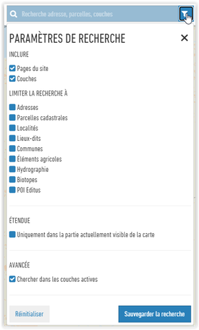 You can thus include or exclude the pages of the static site of the geoportal or the layers, limit the search to certain topics such as for example addresses or cadastral parcels.