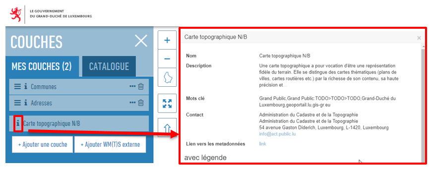 It is now also possible to view the metadata and the legend of the currently active background layer via the my layers section. Here the layer is found among your selected layers and it is possible to activate the legend and the metadata by clicking on the "I" next to the name of the layer